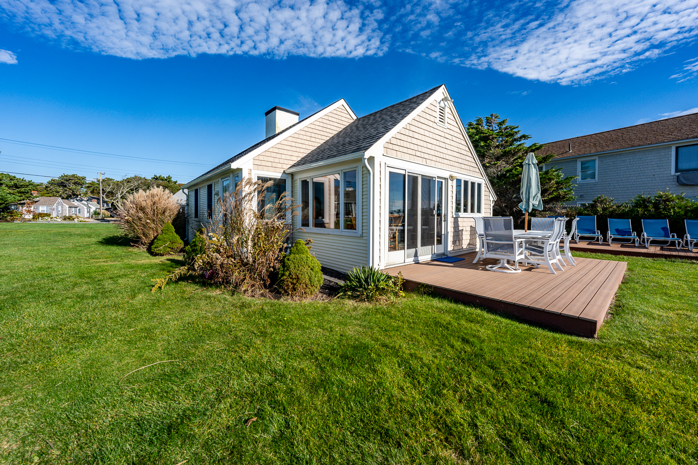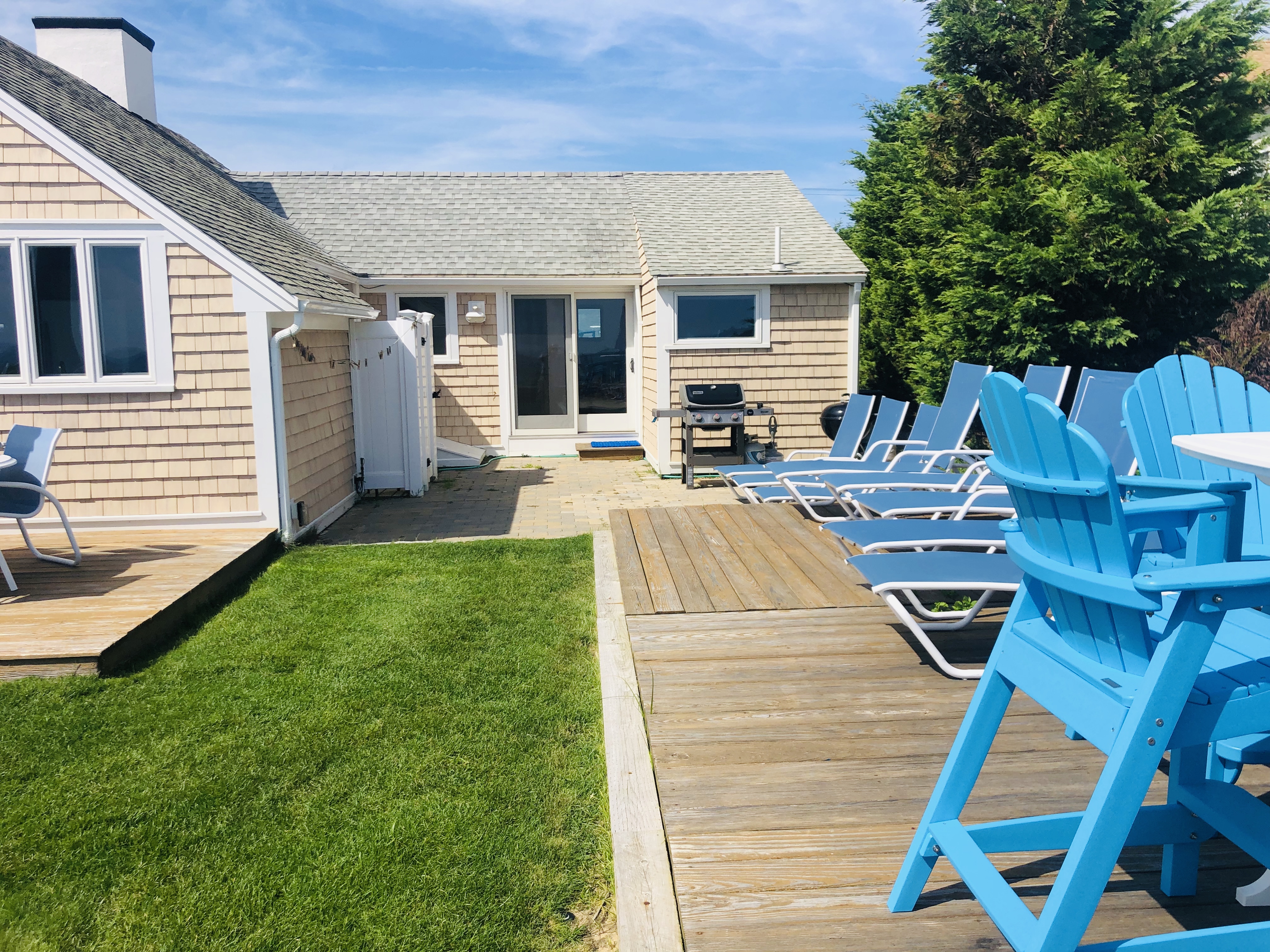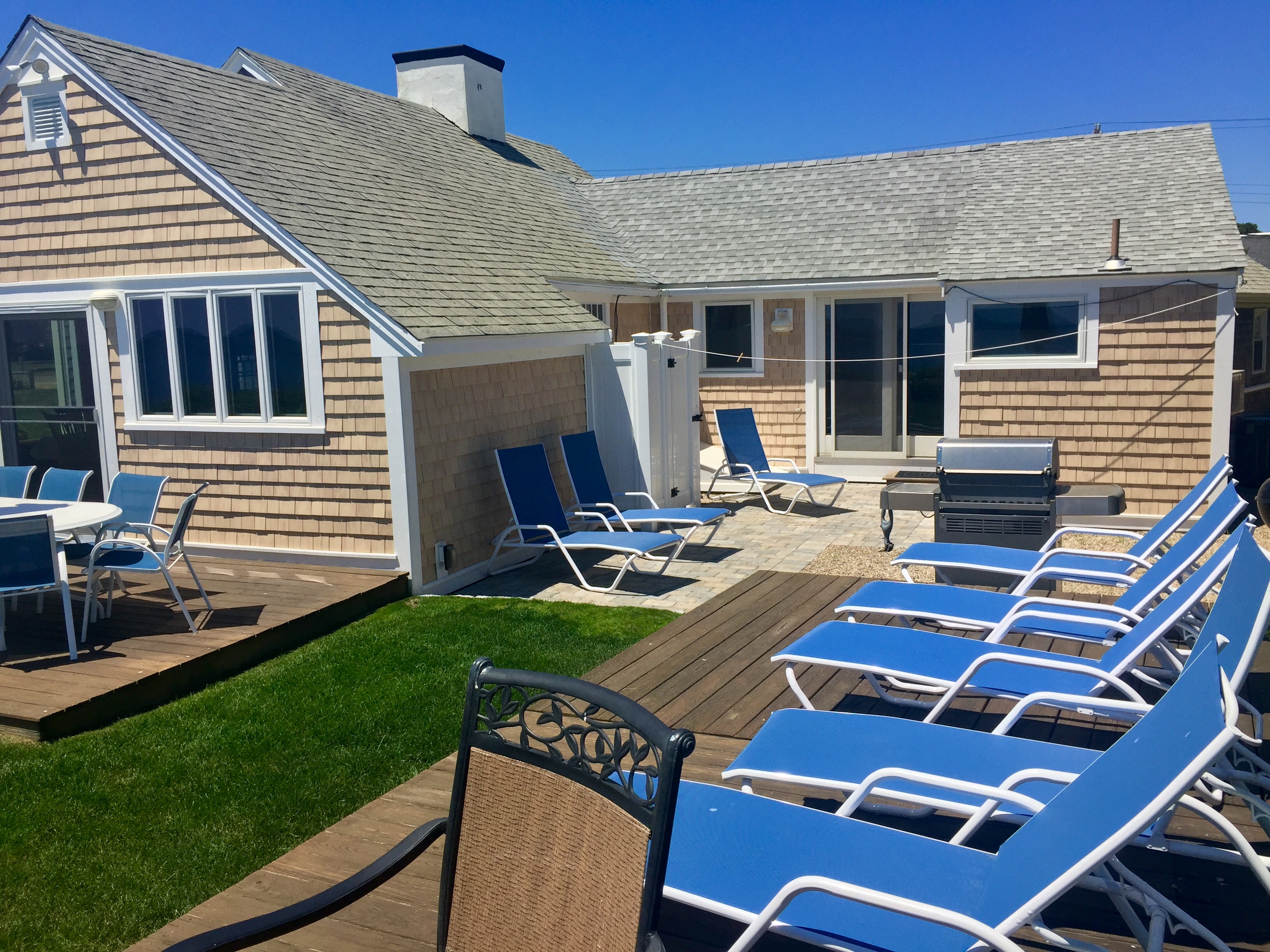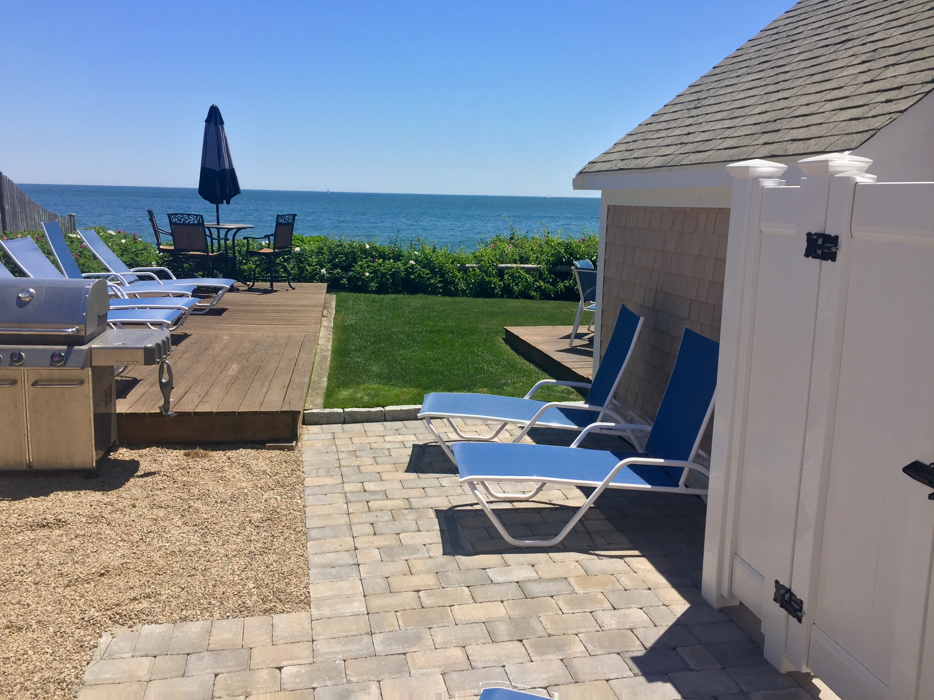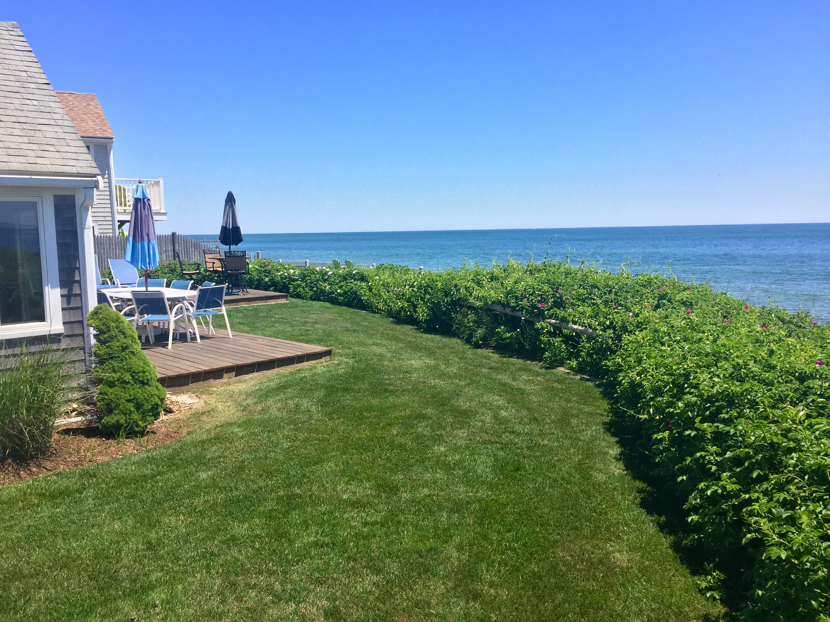 WATERFRONT HOME: The home is located directly on the sparkling Nantucket Sound, the warmest water on Cape Cod, with a sandy private beach, professionally landscaped yard with manicured green grass and loads of pink and white beach roses, 180 degree view of the ocean, two outdoor decks with plenty of chairs, lounges and outdoor dining for 10.