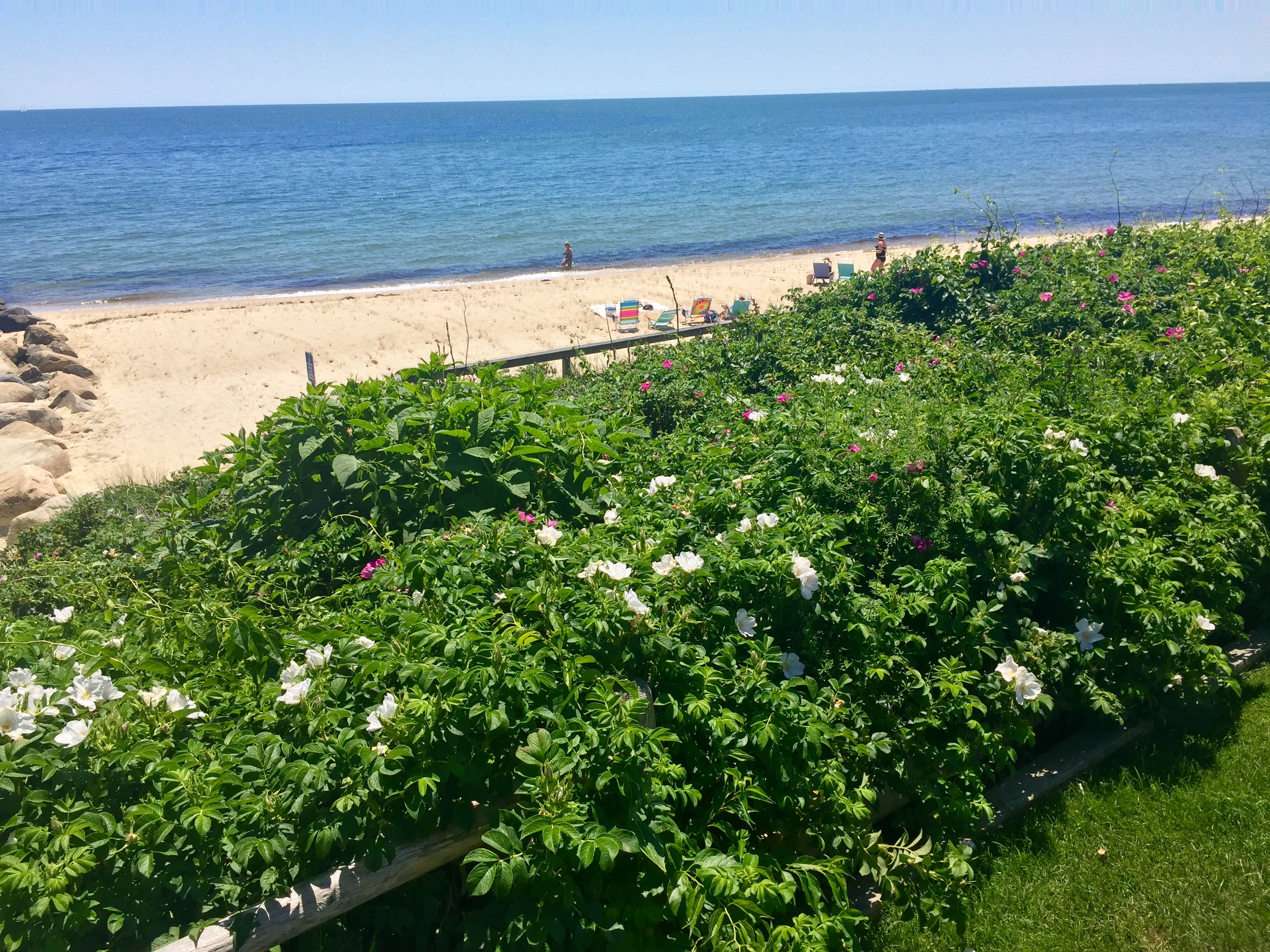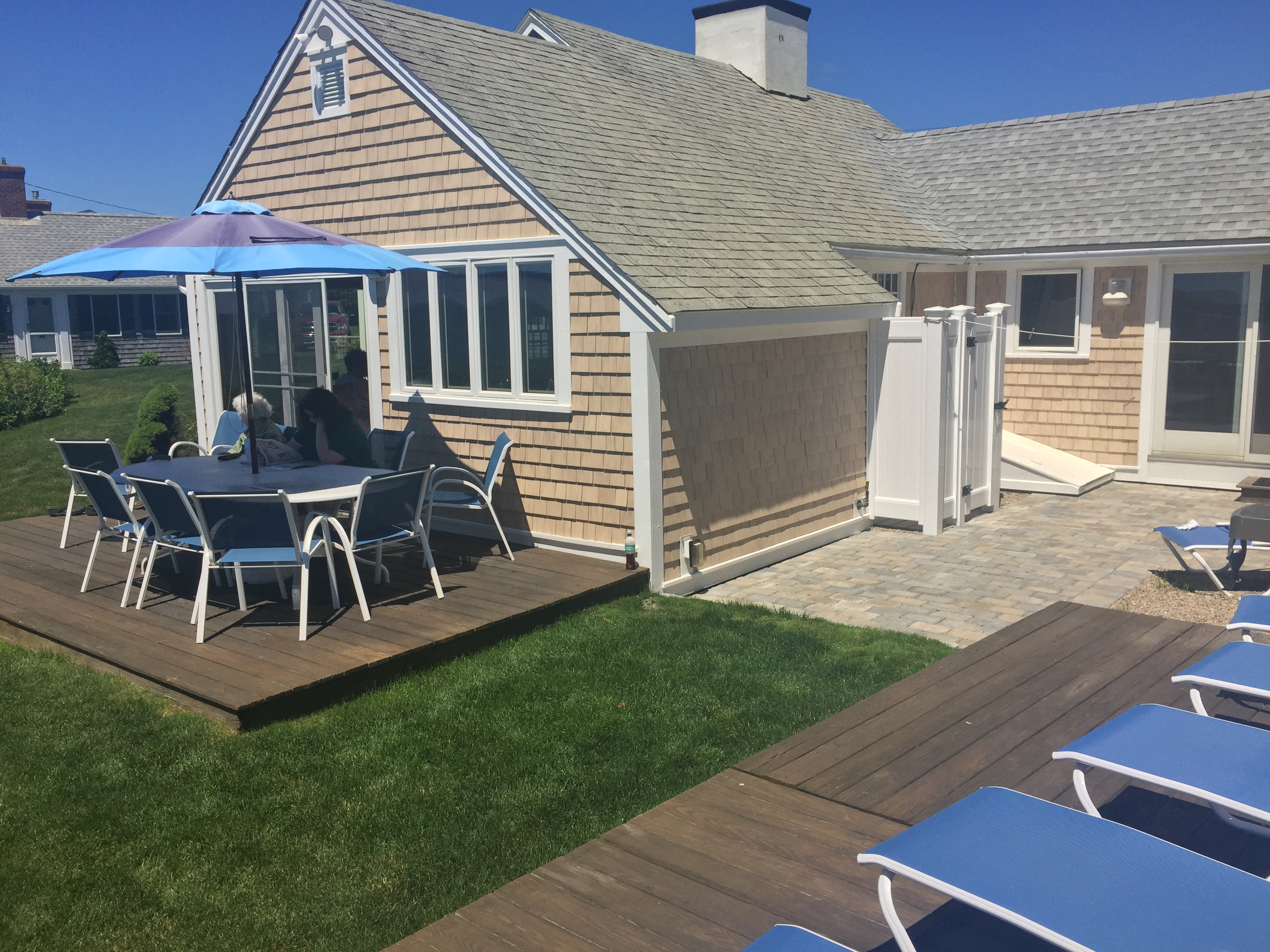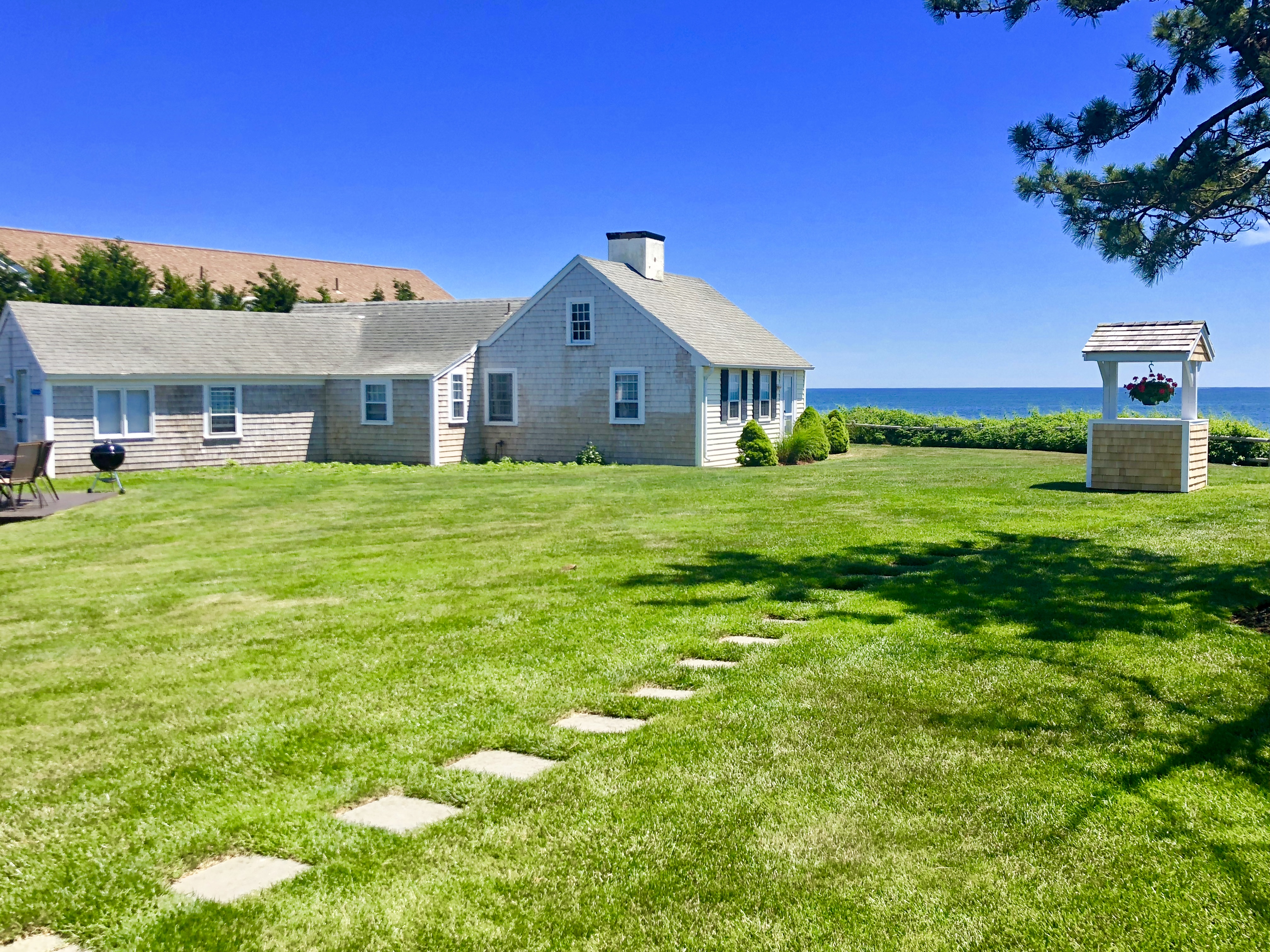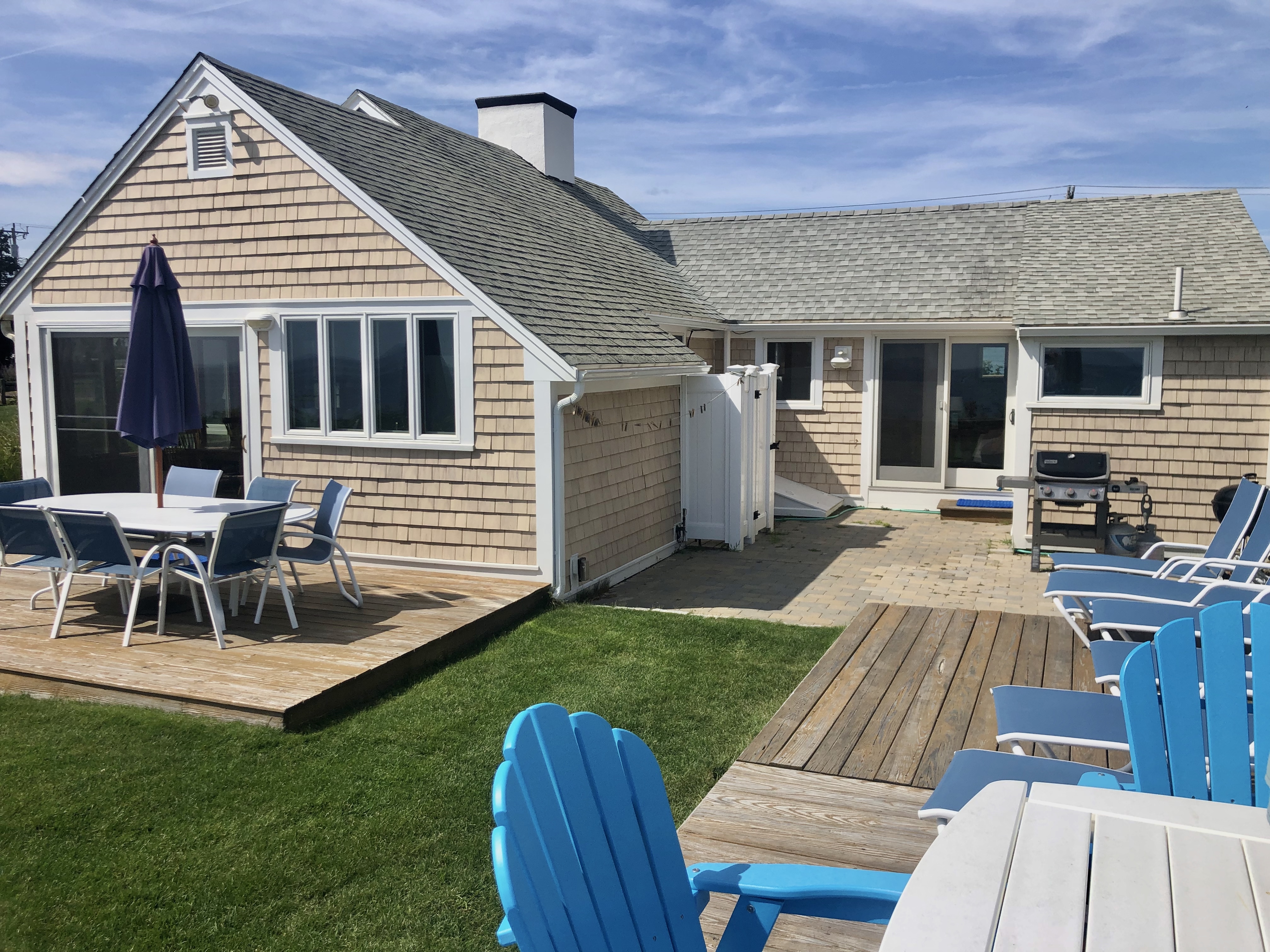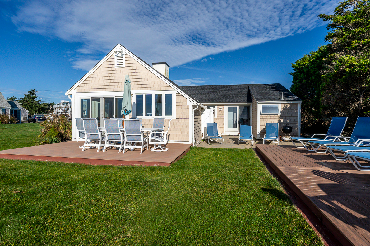 WATERFRONT HOME: The home is located directly on the sparkling Nantucket Sound, the warmest water on Cape Cod, with a sandy private beach, professionally landscaped yard with manicured green grass and loads of pink and white beach roses, 180 degree view of the ocean, two outdoor decks with plenty of chairs, lounges and outdoor dining for 10.