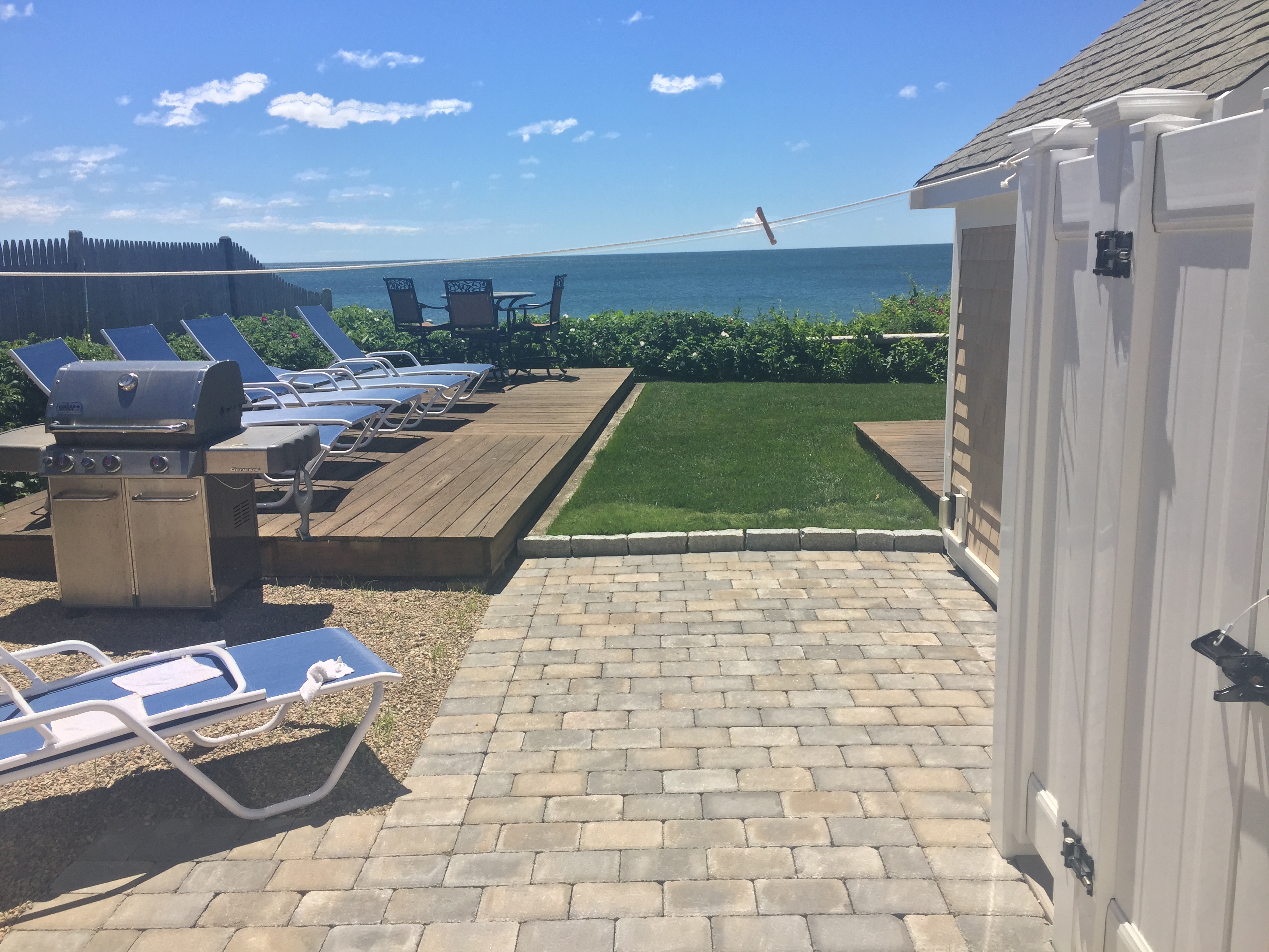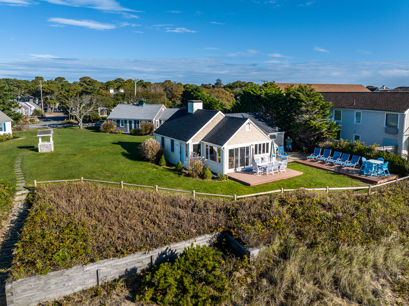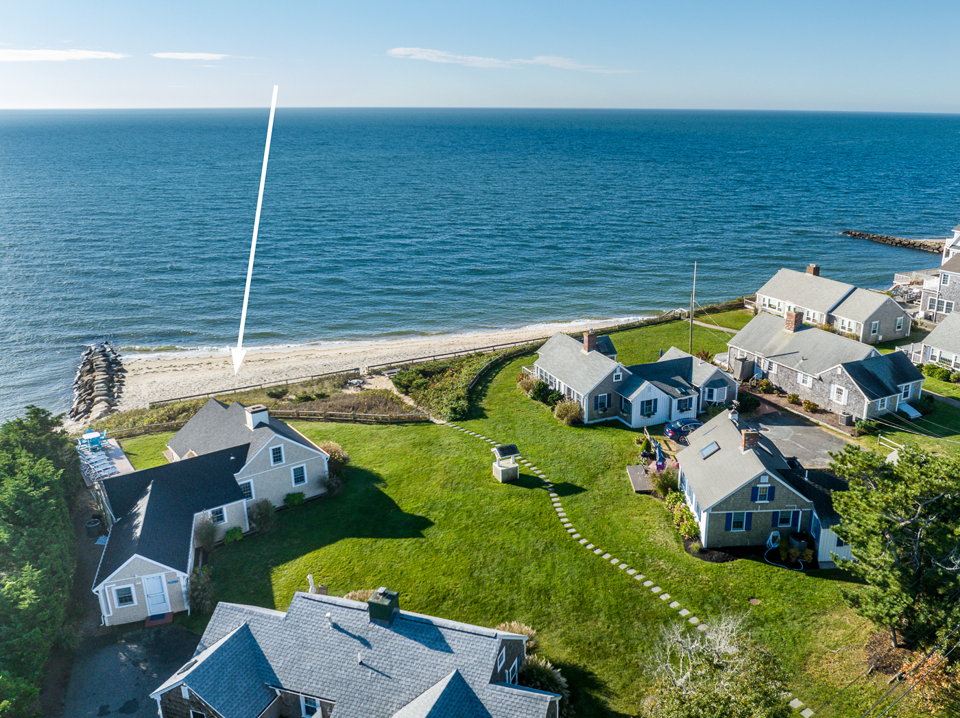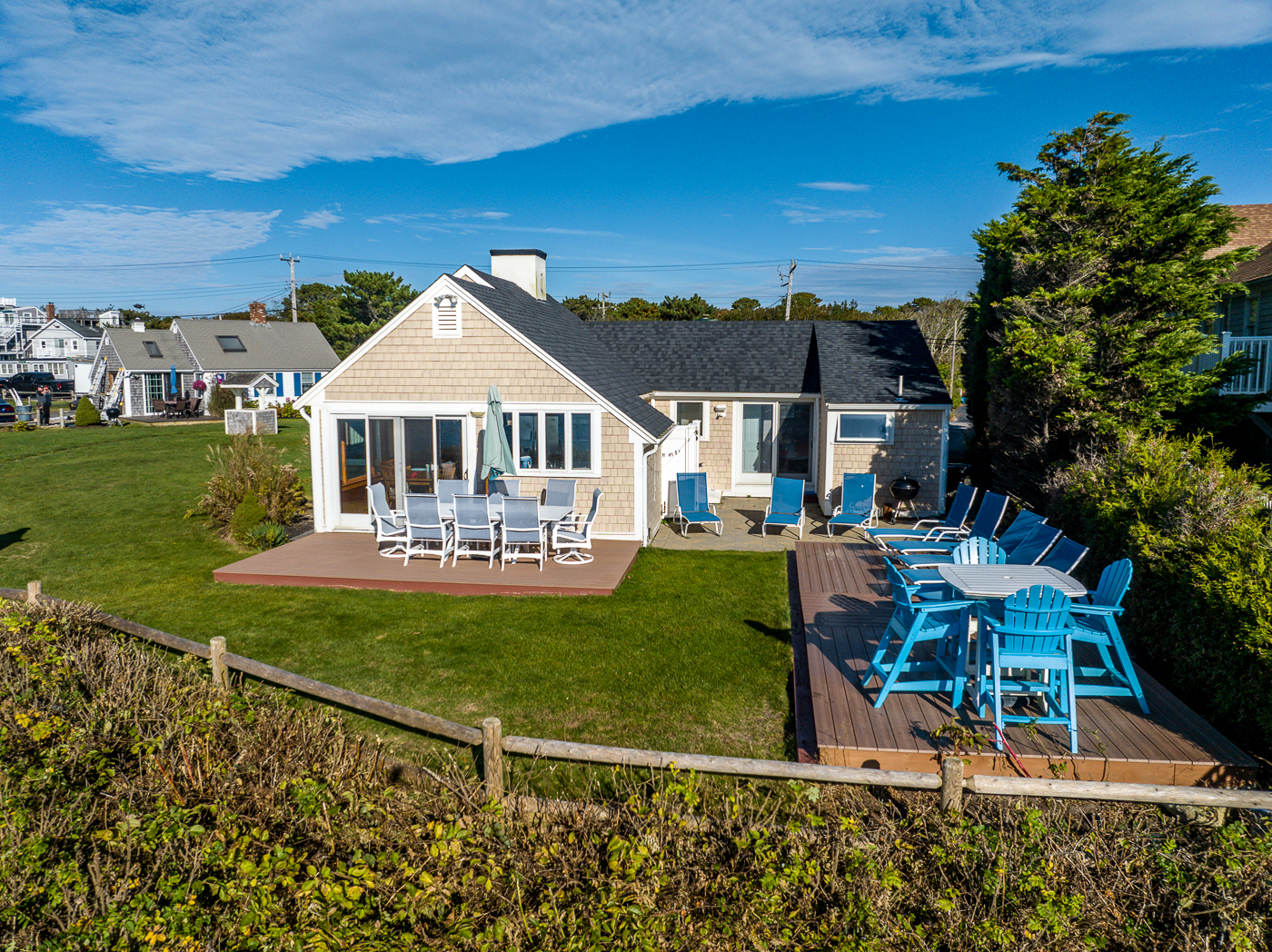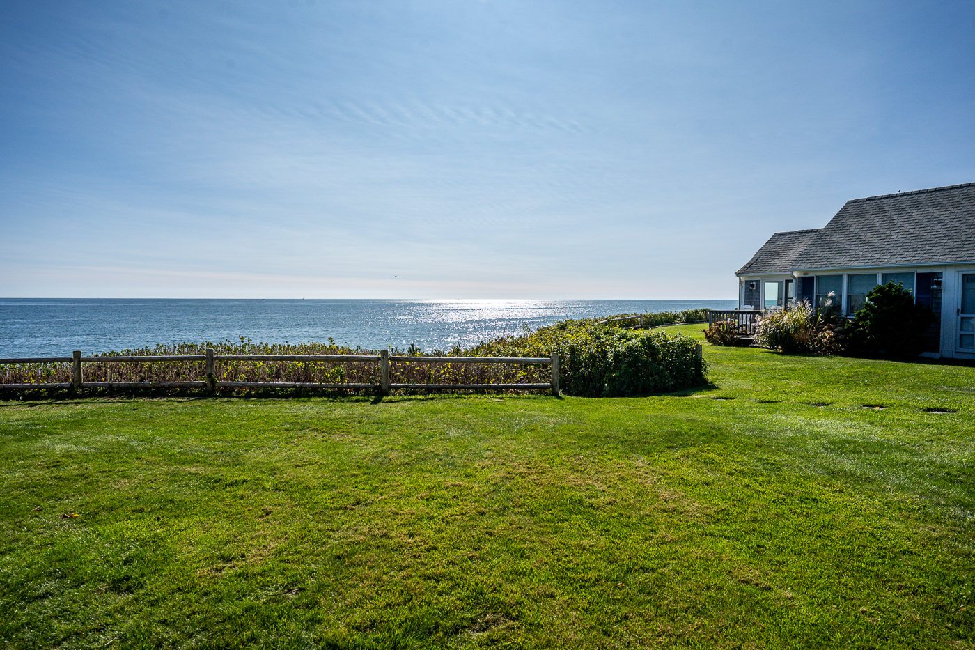 WATERFRONT HOME: The home is located directly on the sparkling Nantucket Sound, the warmest water on Cape Cod, with a sandy private beach, professionally landscaped yard with manicured green grass and loads of pink and white beach roses, 180 degree view of the ocean, two outdoor decks with plenty of chairs, lounges and outdoor dining for 10.