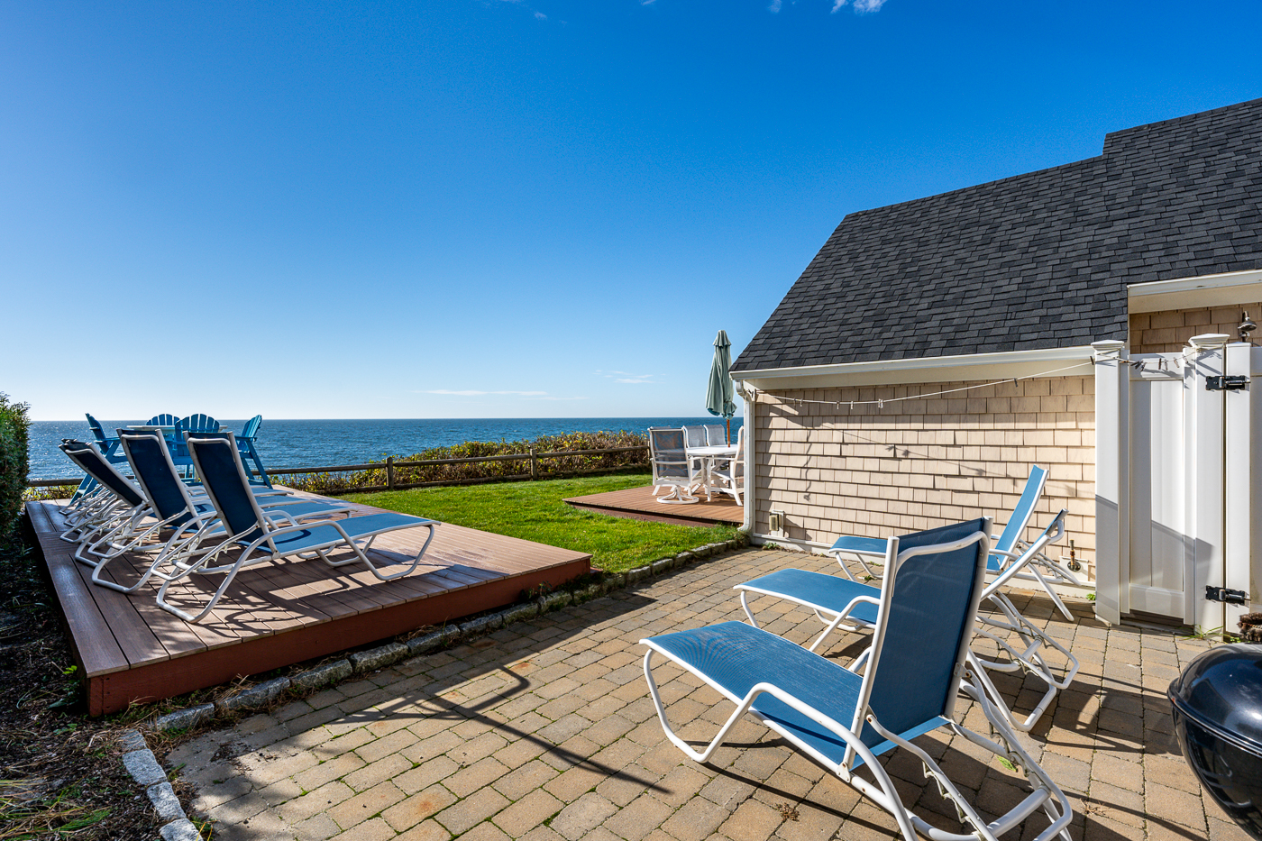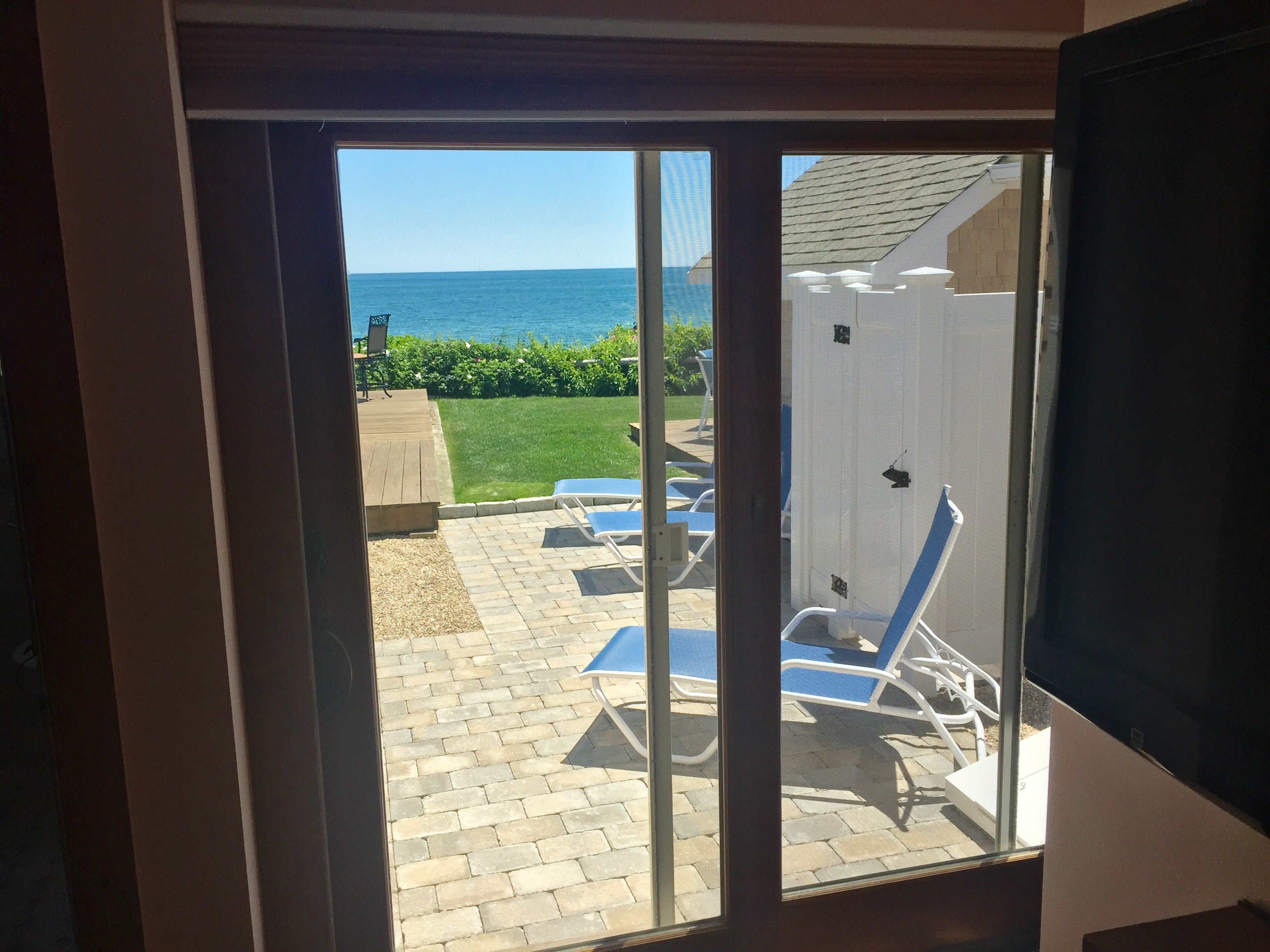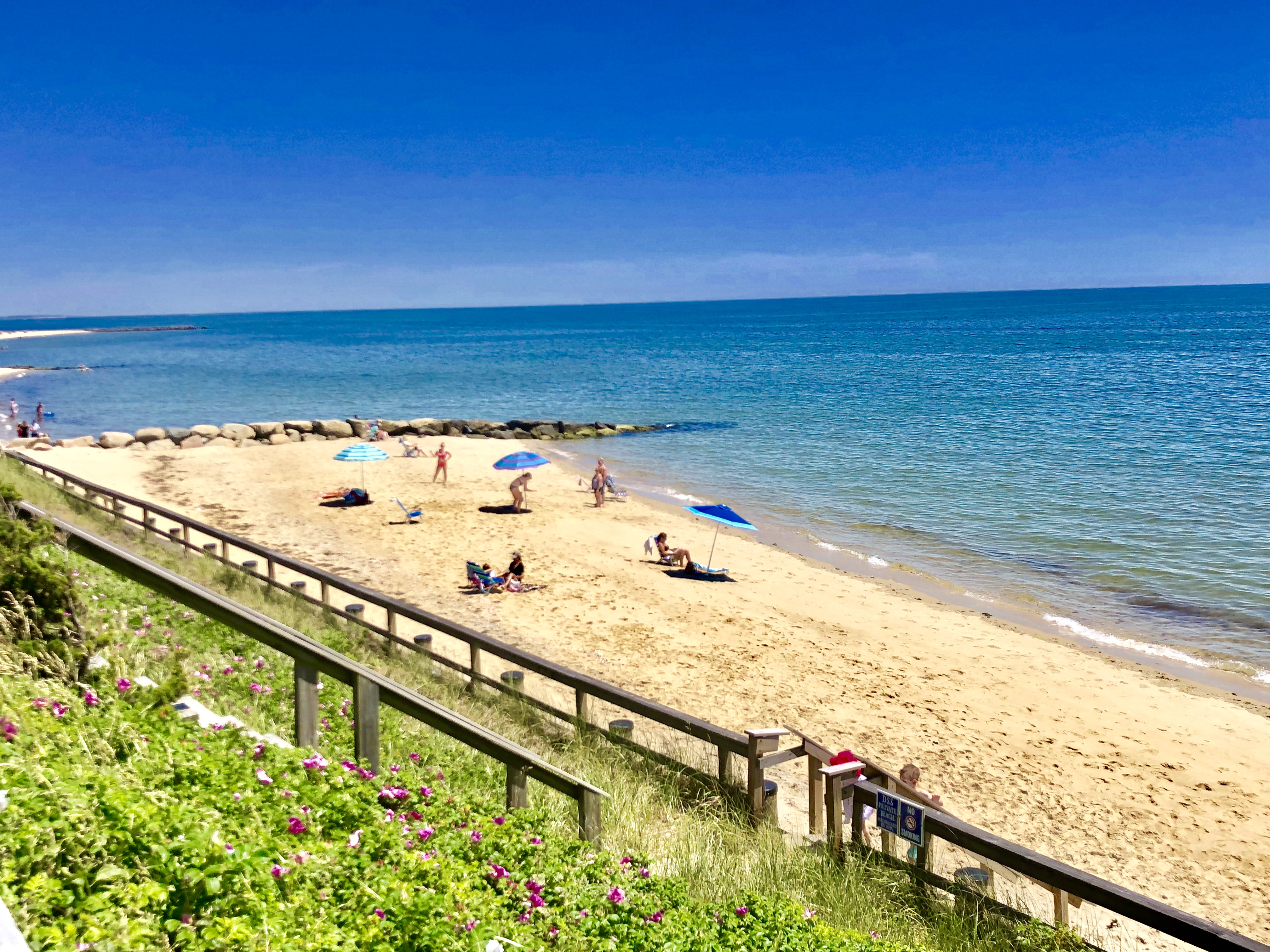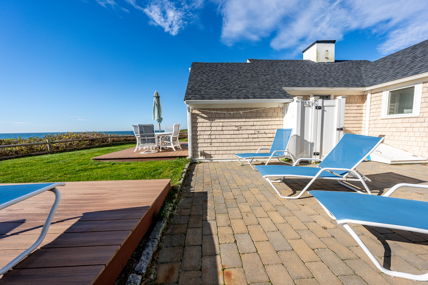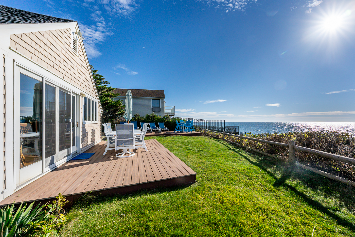WATERFRONT HOME: The home is located directly on the sparkling Nantucket Sound, the warmest water on Cape Cod, with a sandy private beach, professionally landscaped yard with manicured green grass and loads of pink and white beach roses, 180 degree view of the ocean, two outdoor decks with plenty of chairs, lounges and outdoor dining for 10.