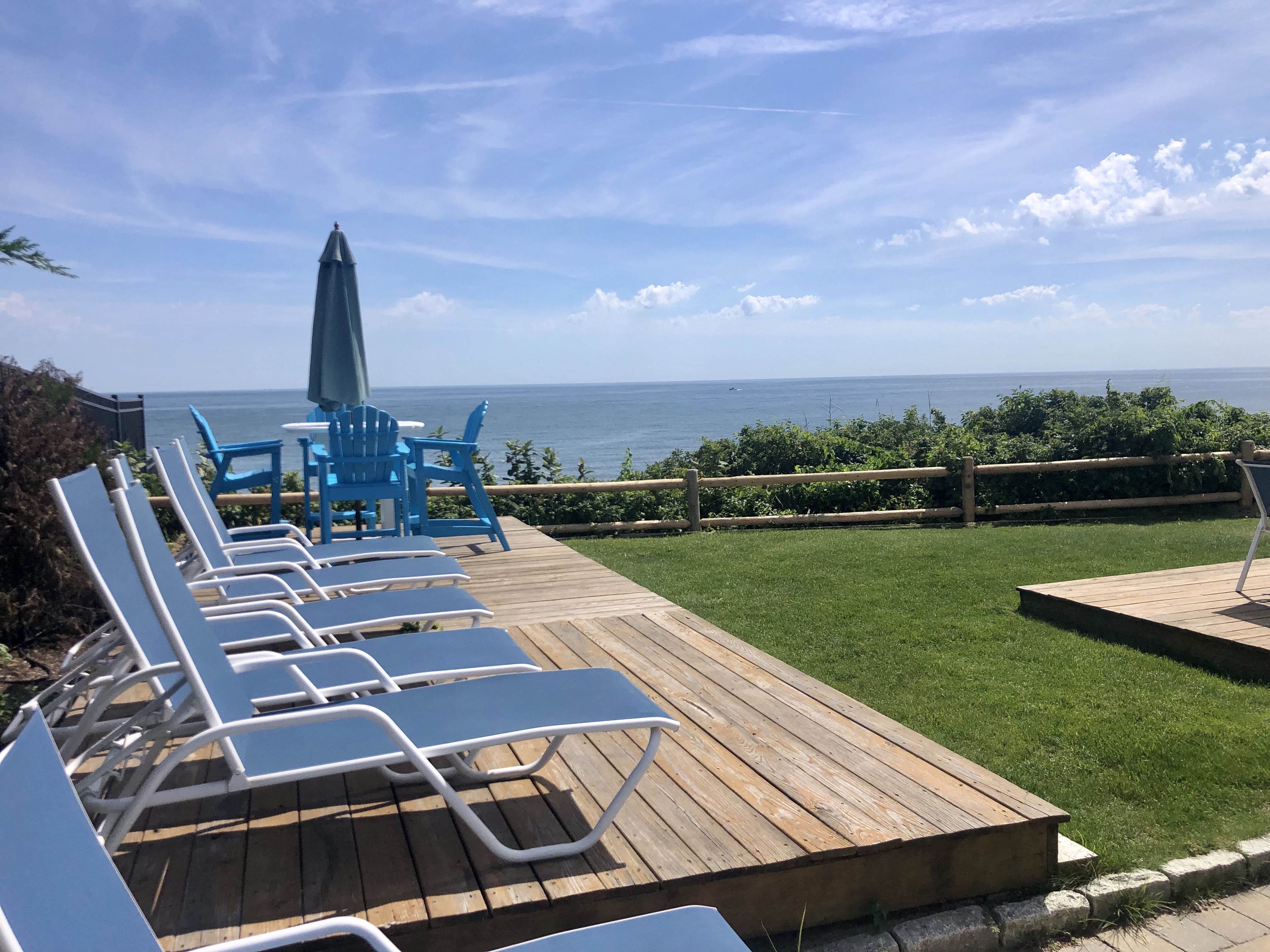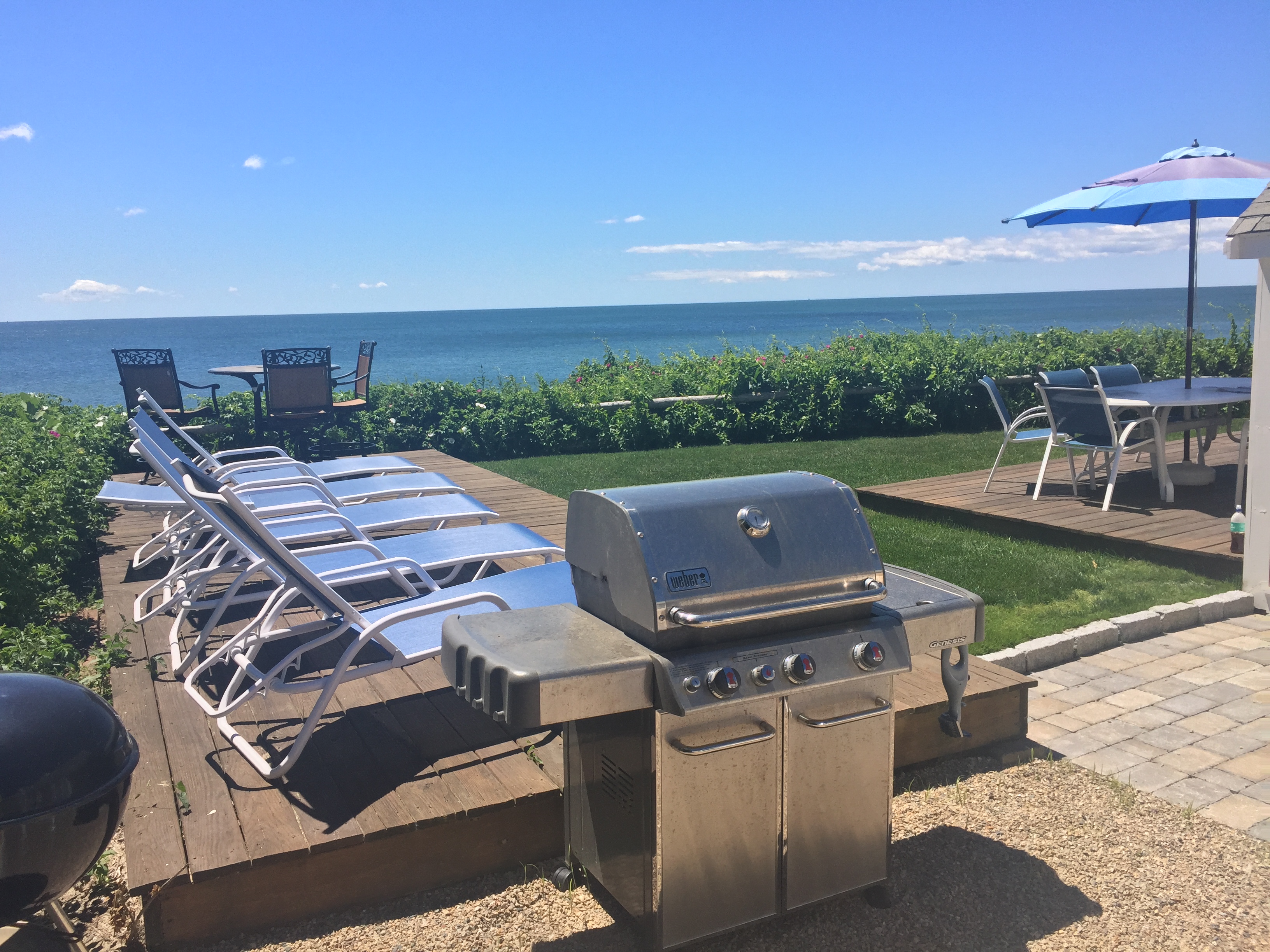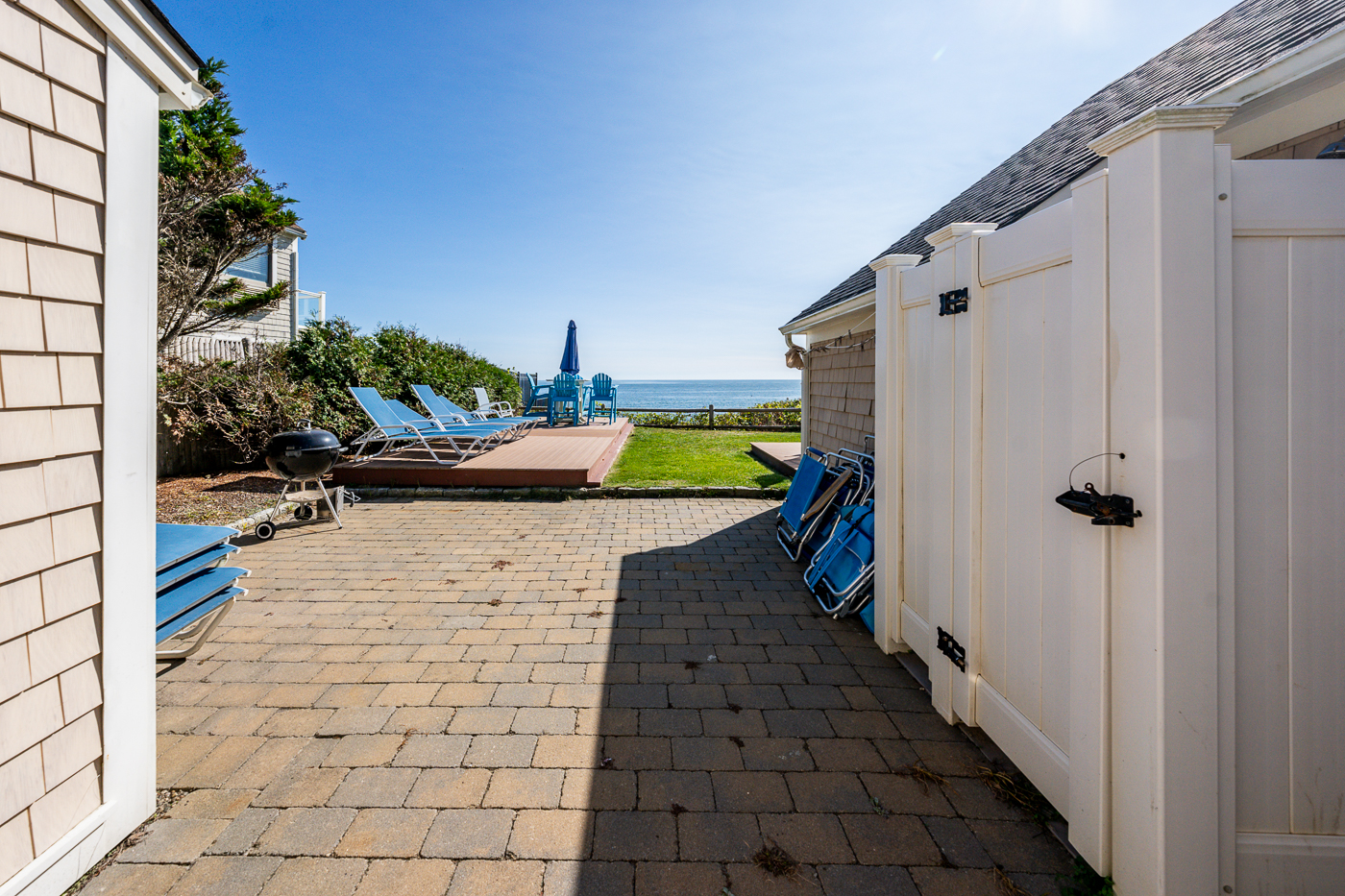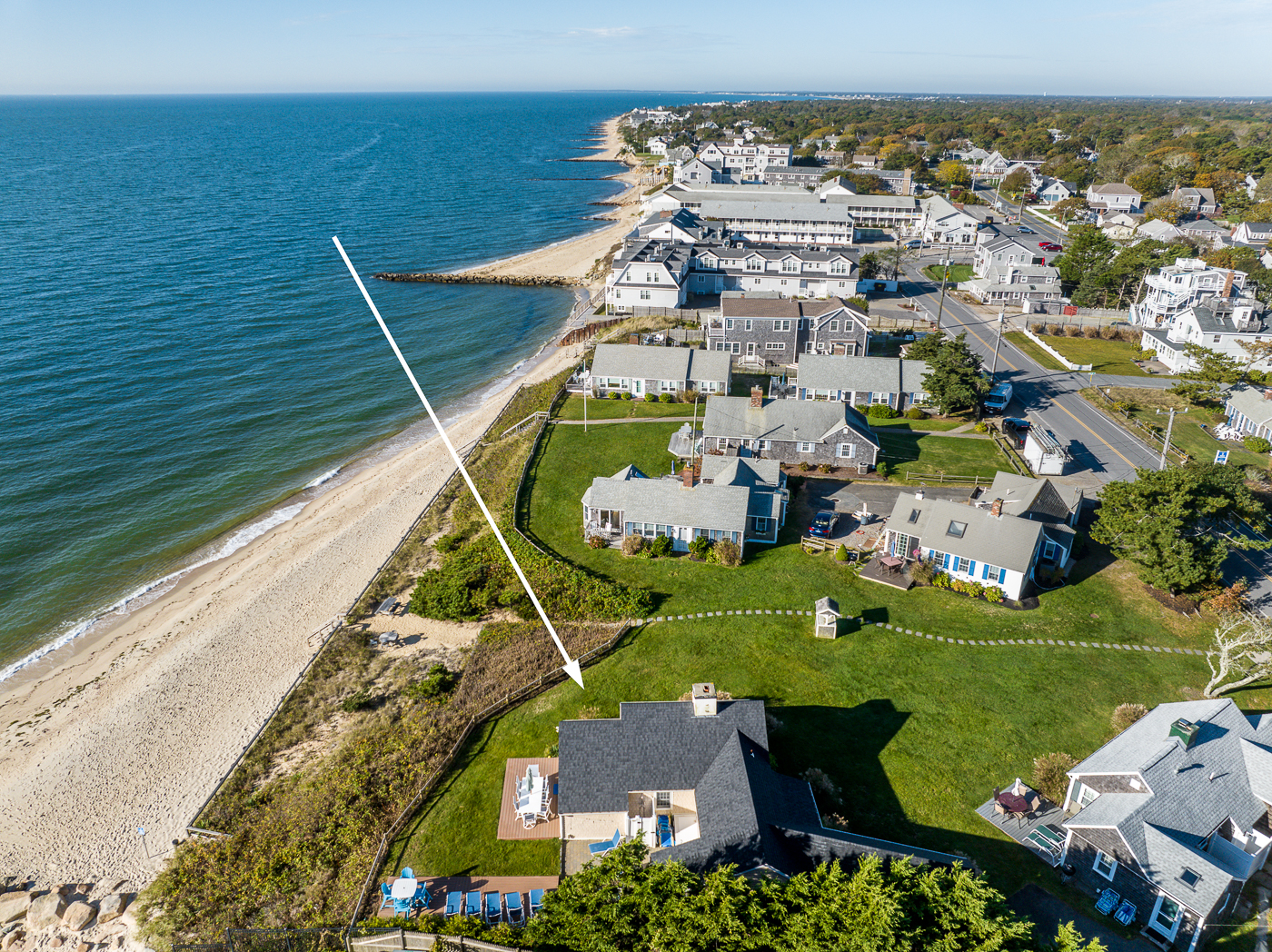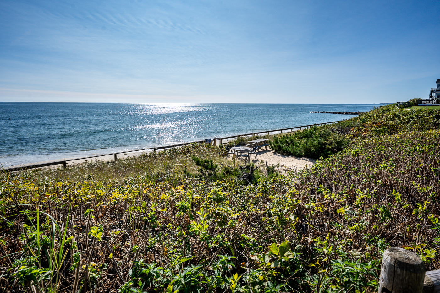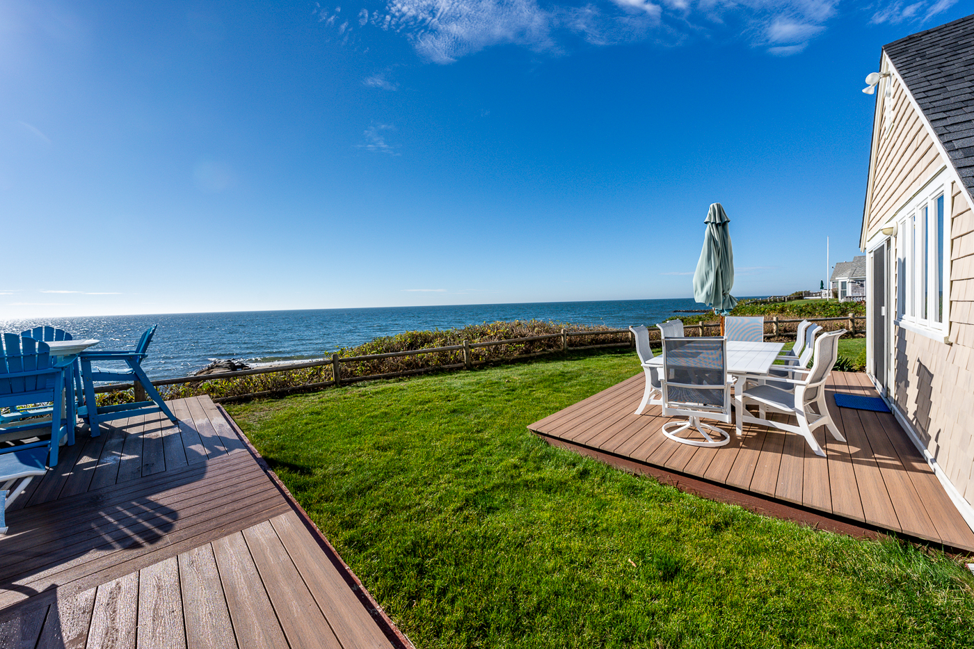 WATERFRONT HOME: The home is located directly on the sparkling Nantucket Sound, the warmest water on Cape Cod, with a sandy private beach, professionally landscaped yard with manicured green grass and loads of pink and white beach roses, 180 degree view of the ocean, two outdoor decks with plenty of chairs, lounges and outdoor dining for 10.